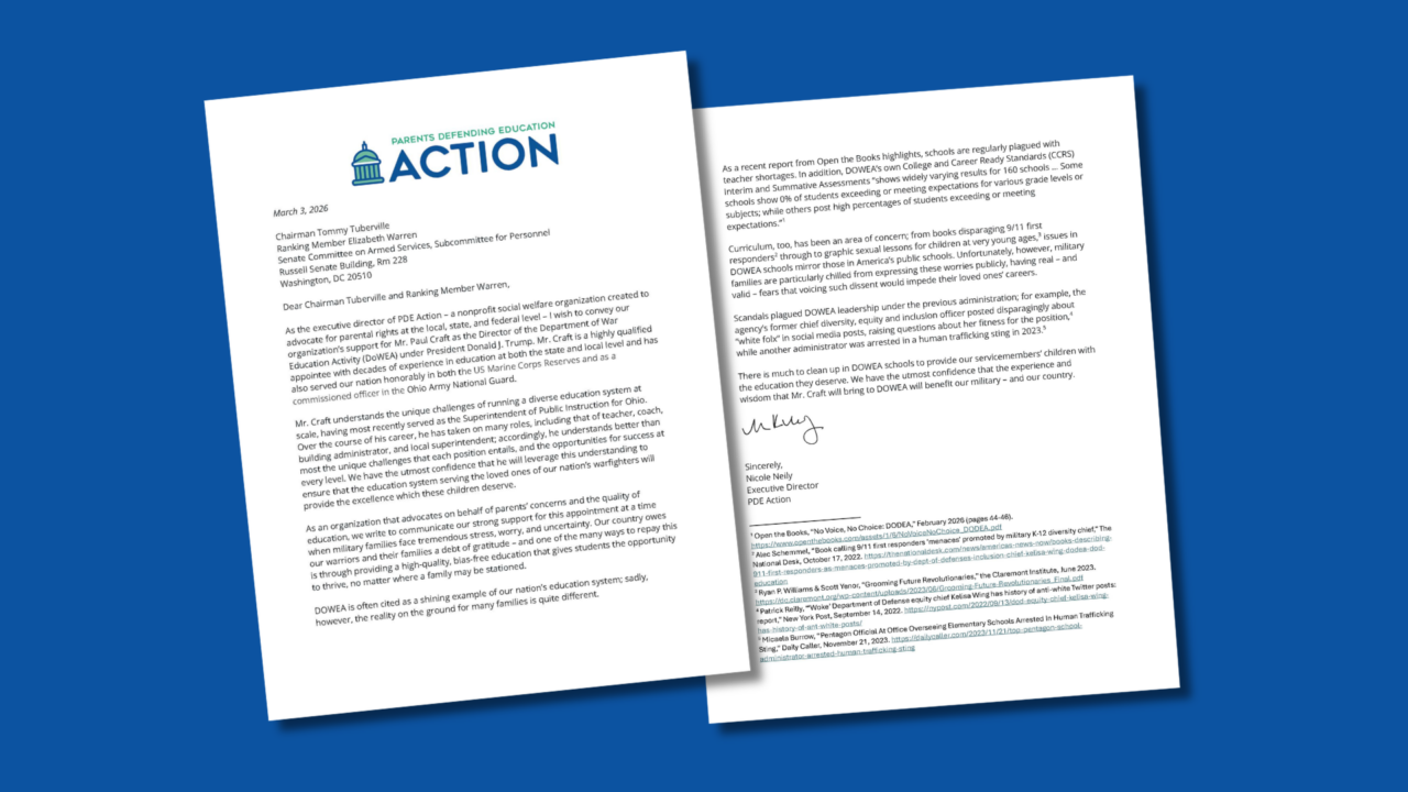 As an organization that advocates on behalf of parents’ concerns and the quality of education, we write to communicate our strong support for this appointment at a time when military families face tremendous stress, worry, and uncertainty. Our country owes our warriors and their families a debt of gratitude – and one of the many ways to repay this is through providing a high-quality, bias-free education that gives students the opportunity to thrive, no matter where a family may be stationed.